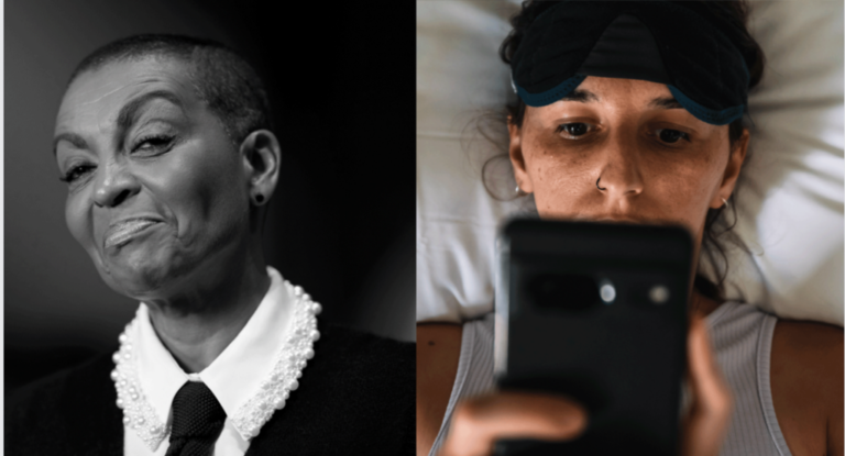 Woman lying in bed with her phone searching for a yoga nidra YouTube video