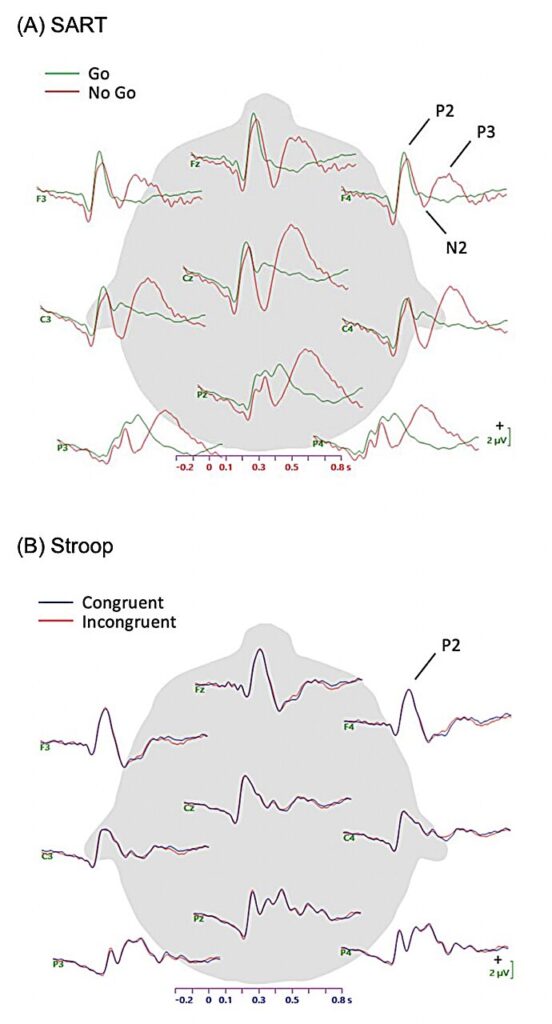 Whereas SART is usually used to check members’ means to remain targeted on the directions of a activity for a very long time, the Stroop check assesses selective consideration, or in different phrases the flexibility to solely give attention to one facet of introduced stimuli (i.e., the colour versus the which means of phrases). Whereas members accomplished these two duties, Compton and her collaborators measured the electrical exercise within the mind utilizing an electroencephalogram (EEG).