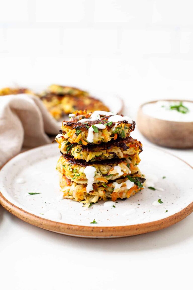 Ready in 30 minutes or less, these kohlrabi fritters are perfect for a quick and delicious weeknight dinner. Filled with shredded vegetables like kohlrabi, zucchini and carrot, these crispy fritters are topped with a lemony herb yogurt sauce.