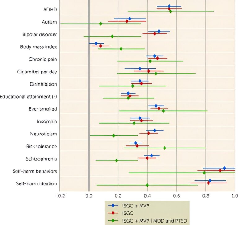 The analysis highlights sturdy genetic hyperlinks between suicide try and elements that affect bodily and behavioral well being—together with impulsivity, smoking, persistent ache, ADHD, pulmonary circumstances, and coronary heart illness. These findings counsel that a number of the genetic underpinnings of suicide are shared with these circumstances.