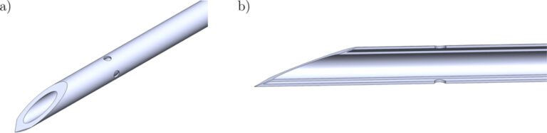 Various OxIVF needle design illustrating lateral orifices for the flushing fluid touring via the outer lumen to be redirected outwards with the purpose of reaching an analogous intra-follicular stream excitation habits to that induced by the arrow-head OxIVF needle. (a) Common three-dimensional view and (b) cross-section view of this design variation. Credit score: Journal of Biomechanics (2023). DOI: 10.1016/j.jbiomech.2023.111832