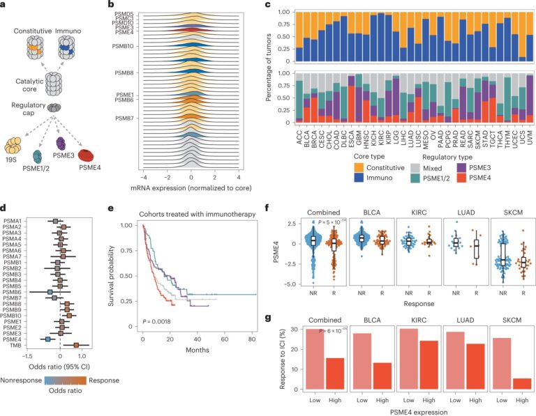 a, Schematic illustration of proteasome complexes together with the catalytic and regulatory subunits. b, The distribution of expression of every proteasome subunit throughout the most cancers cohorts. Subunits are sorted by variance (n = 9,724 tumors). c, Tumors had been clustered by the expression of both the catalytic (prime) or regulatory subunits (backside). The odds of tumors in every most cancers kind that had been assigned to every cluster are indicated (n = 9,724 tumors). Abbreviations for most cancers varieties are in keeping with TCGA. d, The impact dimension (calculated because the log2 odds ratio for response versus no response) and significance of the proteasome subunit biomarkers and TMB in meta-analysis throughout all cohorts incorporating the impact sizes and normal errors from every particular person cohort (n = 331 BLCA, 134 SKCM, 72 KIRC, 27 LUAD tumors; middle signifies odds ratio with bars at 95% confidence intervals (95% CIs)). e, Kaplan–Meier curve of affected person survival stratified by the regulatory subunit clusters outlined in c for the immunotherapy response cohorts (log-ranked P worth = 0.0018; n = 331 BLCA, 128 SKCM, 27 LUAD tumors). f, The expression of PSME4 within the sufferers who responded to ICI (R) or didn’t reply (NR) from every of the ICI cohorts divided by most cancers kind (n = 331 BLCA, 134 SKCM, 72 KIRC, 27 LUAD tumors) or proven mixed (Wilcoxon rank-sum take a look at P worth = 5 × 10−4). Field plots span the primary to 3rd quartiles and whiskers present 1.5 × interquartile vary. g, Sufferers had been stratified by PSME4 expression within the ICI cohorts and the response charges for the PSME4-low and PSME4-high teams are proven (χ2 P = 6 × 10−5; variety of tumors as in f). BLCA, bladder urothelial carcinoma; KIRC, kidney renal clear cell carcinoma. Credit score: Nature Most cancers (2023). DOI: 10.1038/s43018-023-00557-4