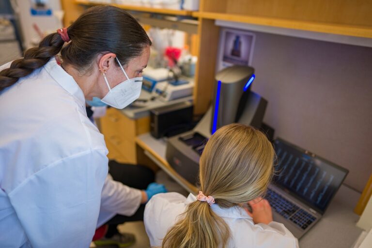 Station scientist Maria Carlota Dao (left) and analysis assistant and doctoral pupil Brandy Moser ‘23G work in Dao’s lab. Picture Credit score: College of New Hampshire